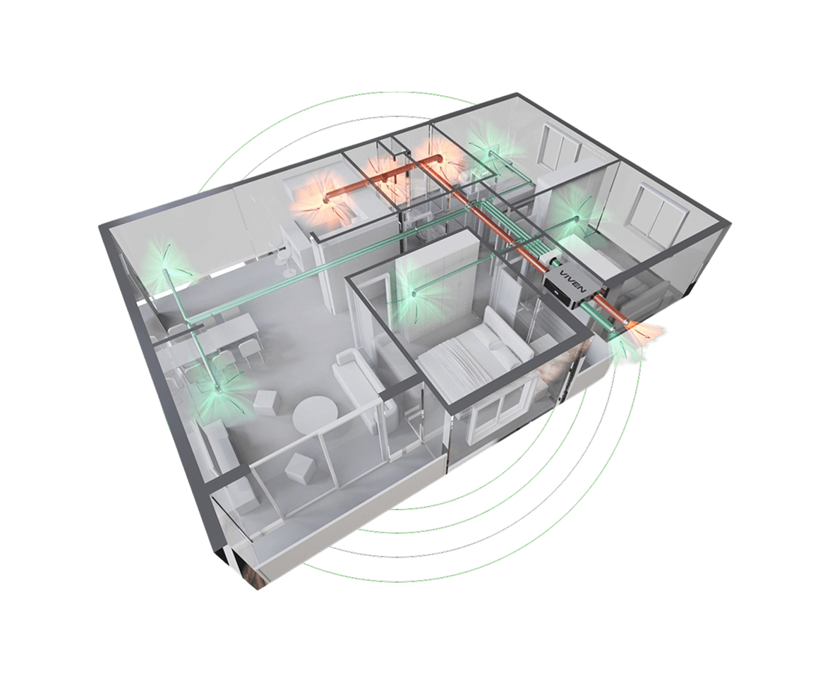 Hệ thống ống dẫn khí được lắp đặt bên trên trần nhà, dưới sàn nhà hay bên trong tường giúp đưa dòng khí mới giàu oxy tới từng góc nhỏ trong nhà của bạn. Đồng thời không khí từ những khu vực dễ bị ô nhiễm như nhà vệ sinh, bếp, phòng giặt, nhà kho được liên tục hút ra. Sự luân chuyển không khí trong lành liên tục 24/7 từ các cửa cung cấp khí tới các cửa thu hồi khí tạo ra một môi trường thoáng mát, khỏe mạnh và sạch bụi cho toàn bộ căn nhà của bạn
